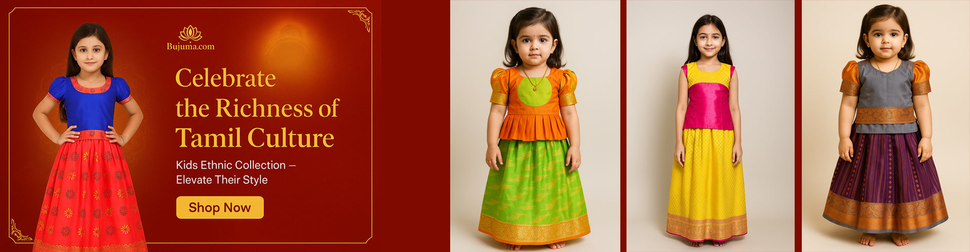 Remember, Bujuma is your one-stop destination for pattu pavadai sattai, cotton pavadai sattai, frocks, gowns, and lehengas that are designed to make your child shine with style and grace.
