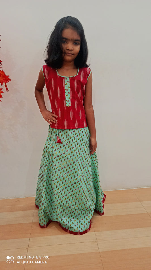 Ikat Printed Cotton Pattu Pavadai Sattai Set – Sleeveless Top