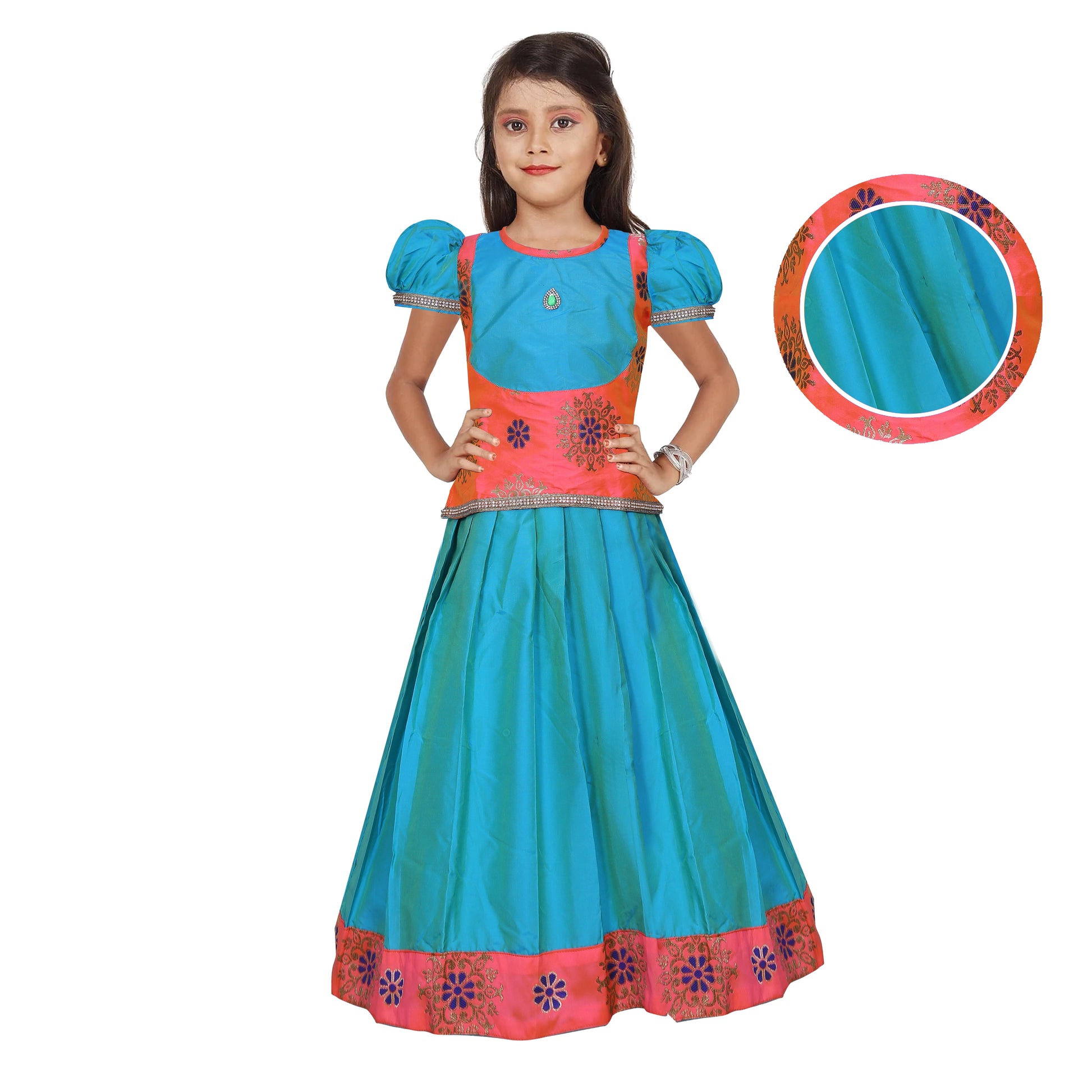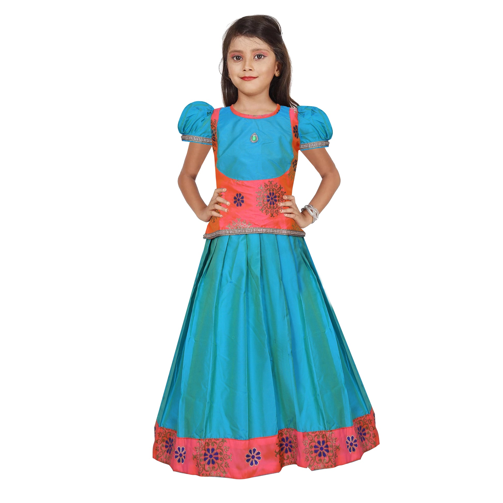 Enchant your little one in the Adorable Cyan Green Pattu Pavadai, a perfect fusion of charm and tradition for a delightful and vibrant ethnic look.