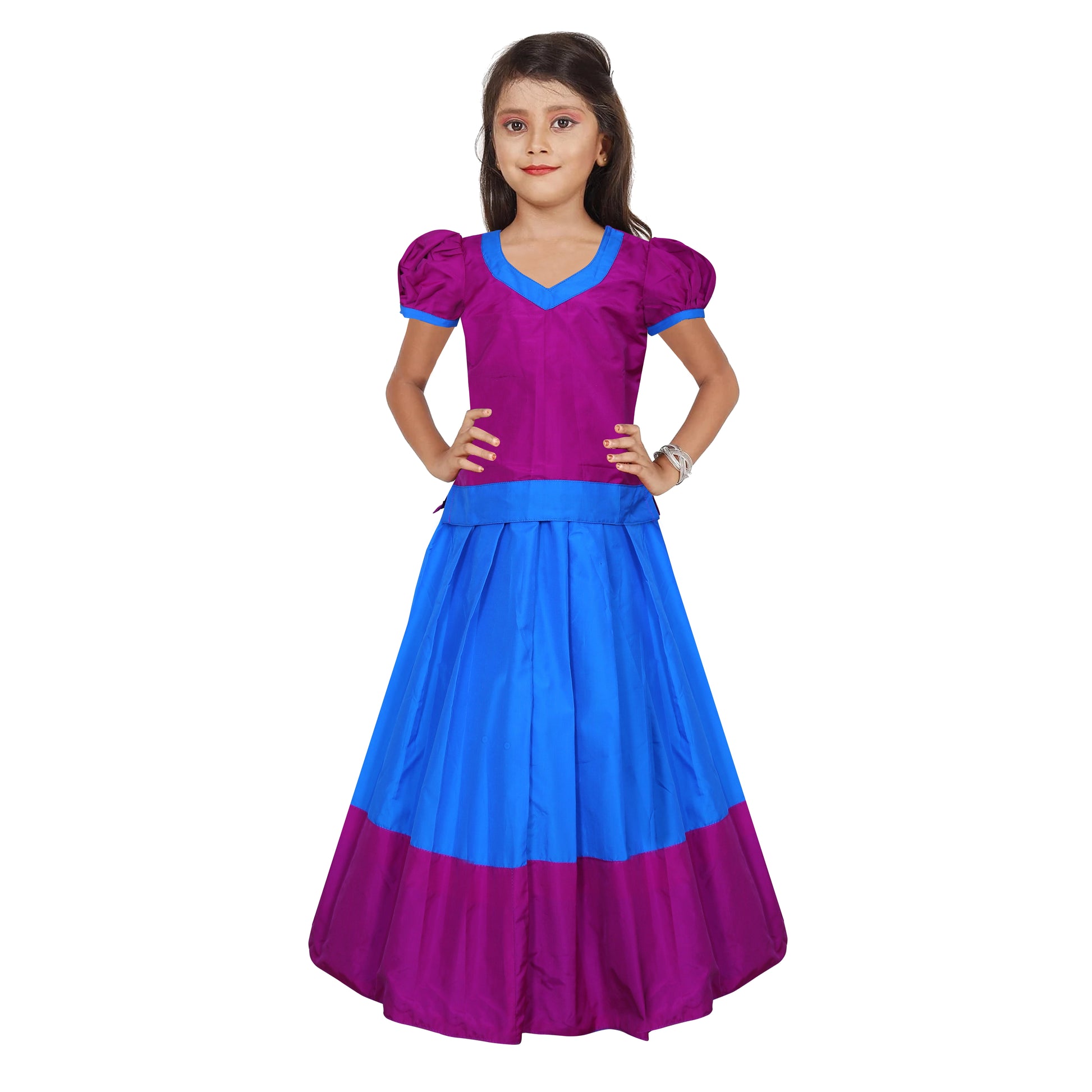 Elevate your little one's style with the enchanting blend of Adorable Deep Pink and Blue Pattu Pavadai, capturing the essence of charm and tradition in a delightful ethnic ensemble.