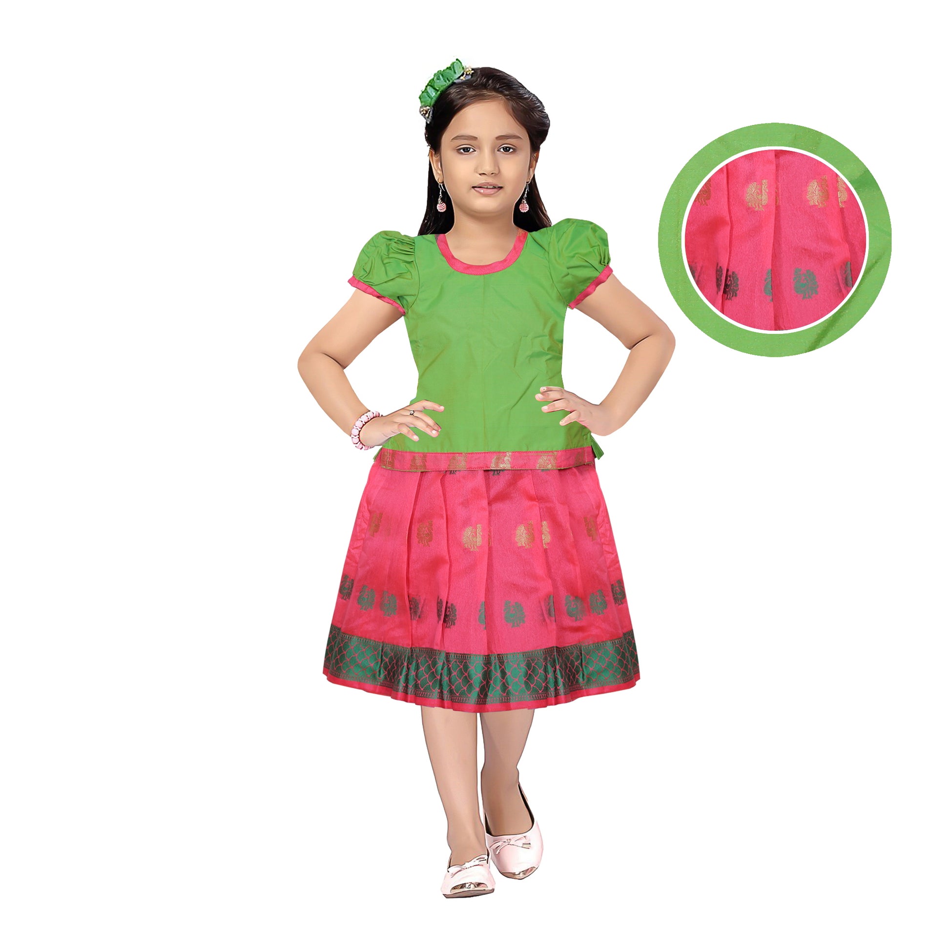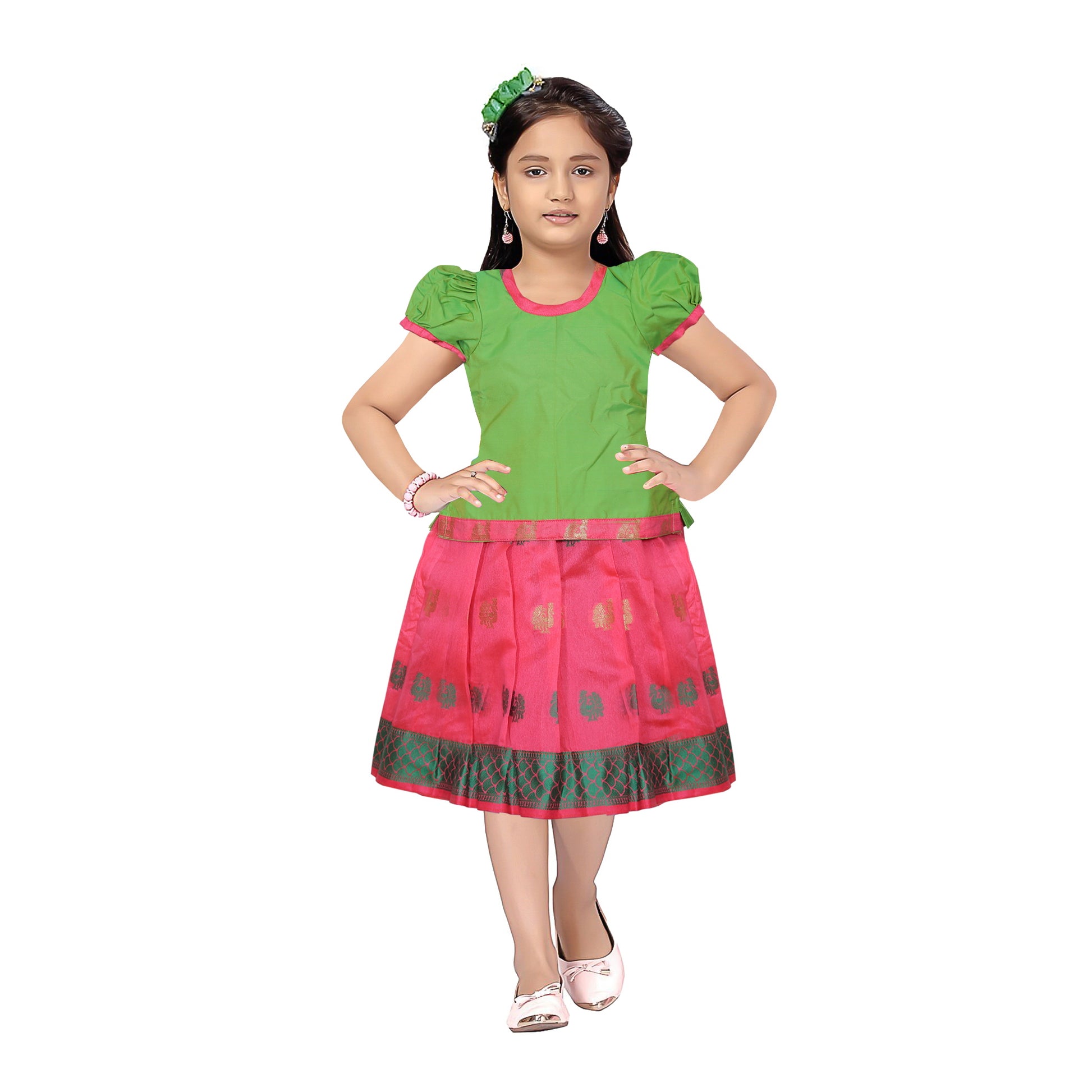 Adorable Green with Pink Pattu Pavadai