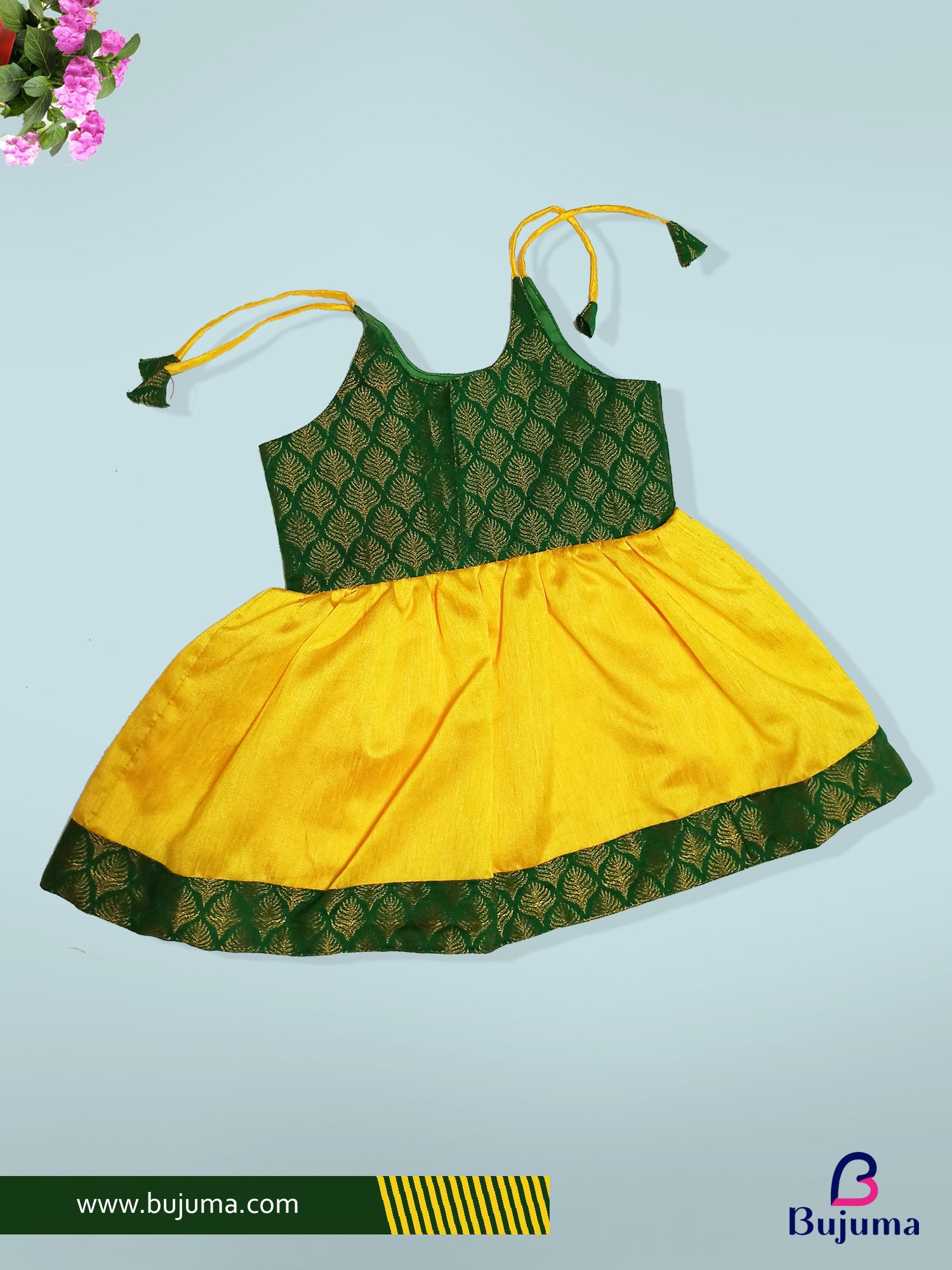 Elevate your baby's style with our dark green and yellow silk frock, combining sophistication and charm for a fashionable look.