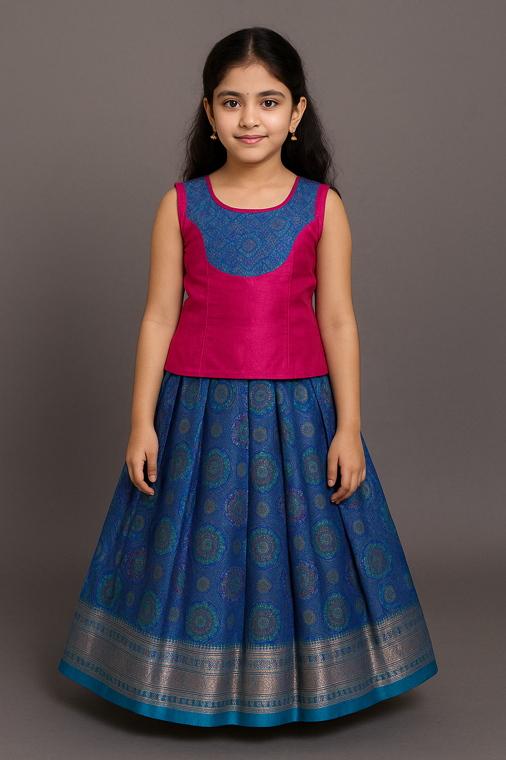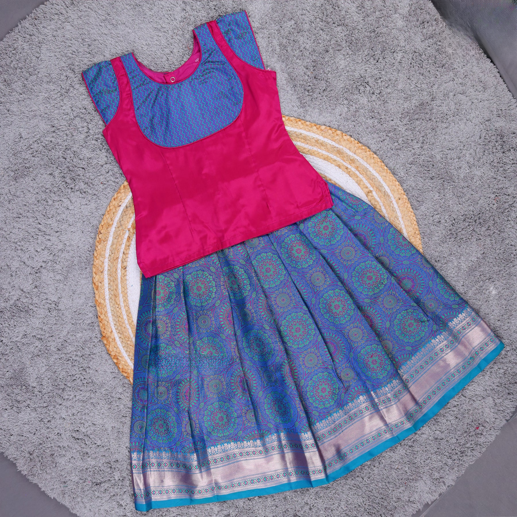 Elegant Pink Blouse & Blue Zari Woven Skirt Pattu Pavadai