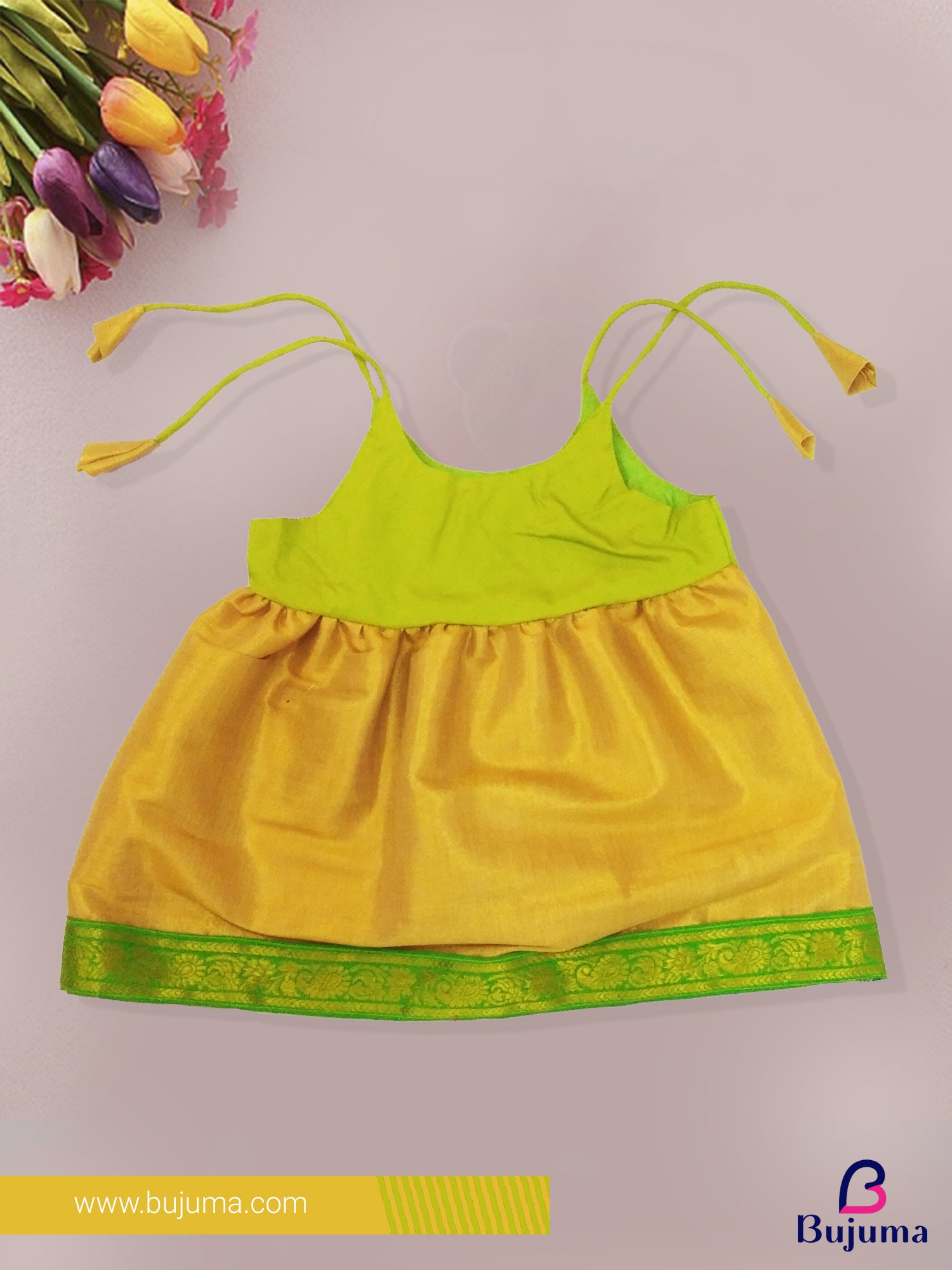 Dress your little princess in elegance with our lime green and golden silk frock. Explore regal style for young royalty with our enchanting ensemble.