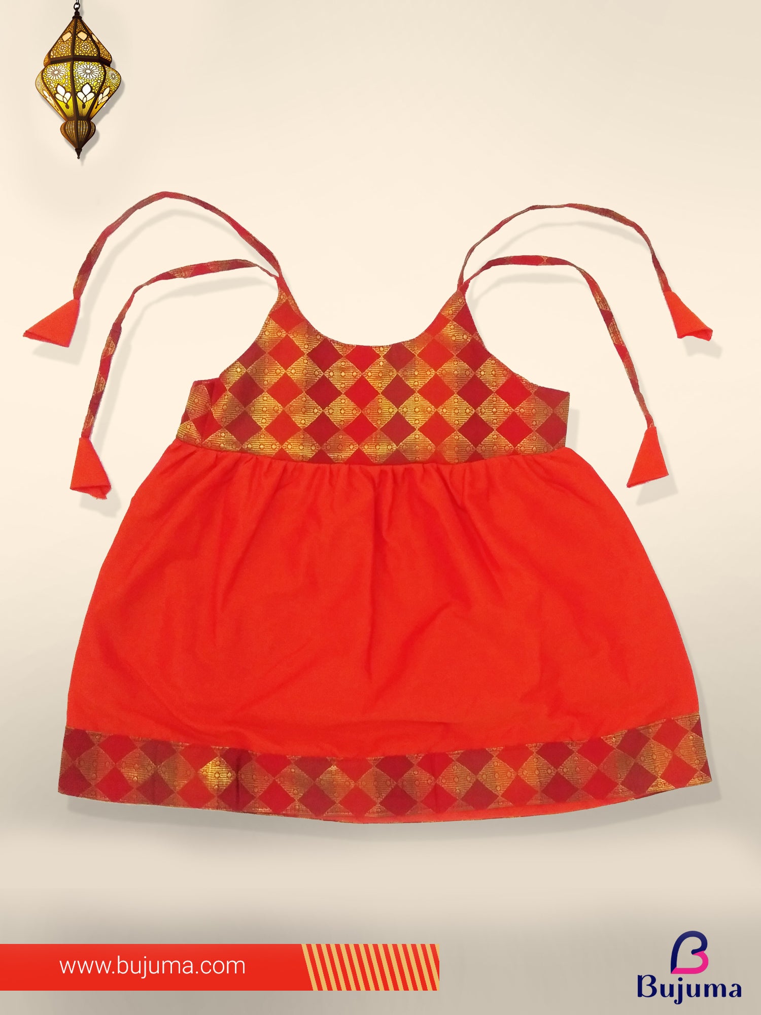 Elevate your baby girl's charm in our vibrant orange-red silk frock. Discover delightful elegance with this perfect blend of color and comfort