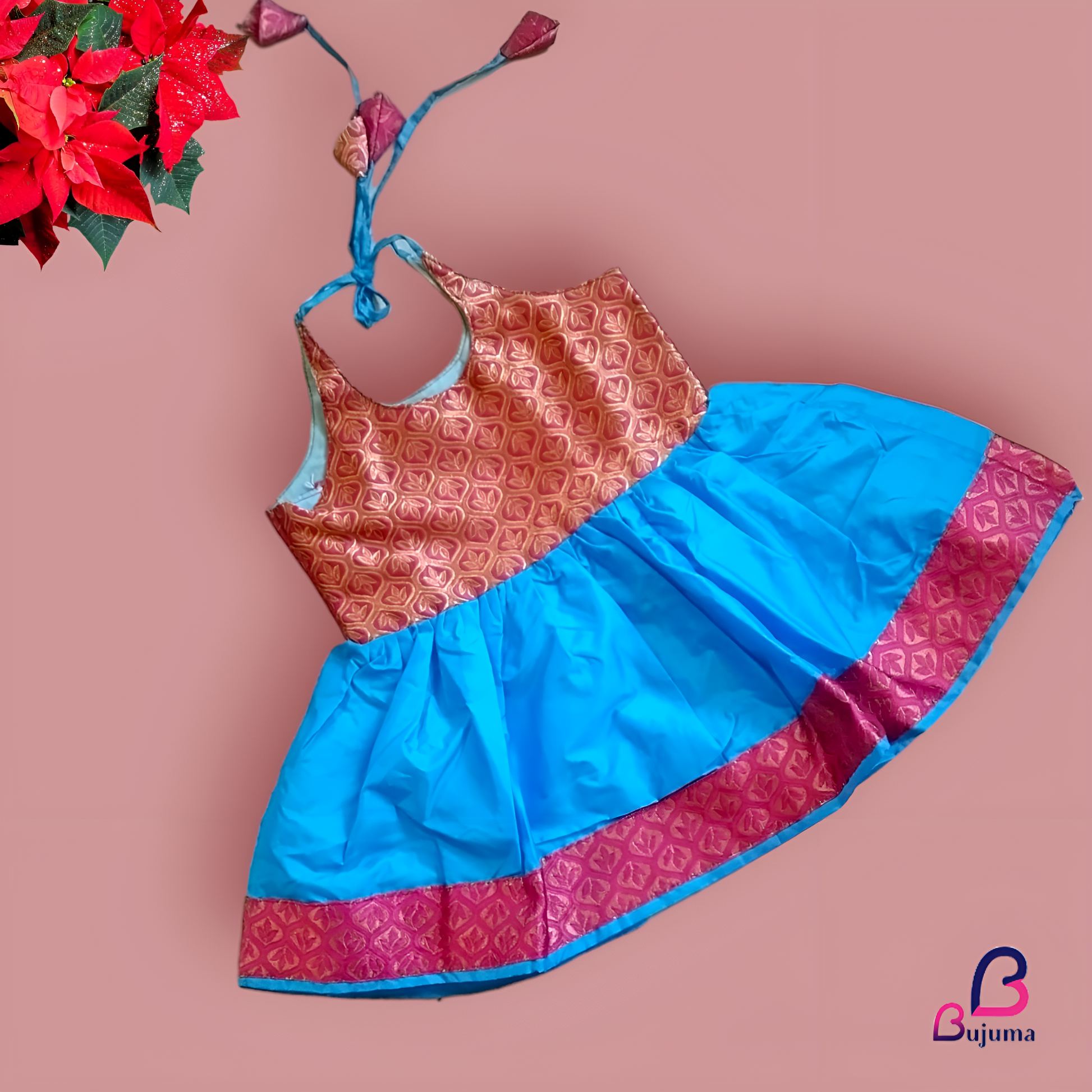 Wrap your baby girl in blooming elegance with our pink floral with blue silk frocks. Unveil a garden of style for her every delightful moment.